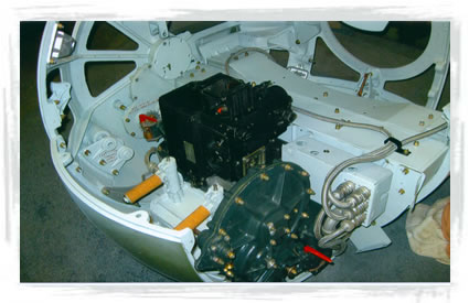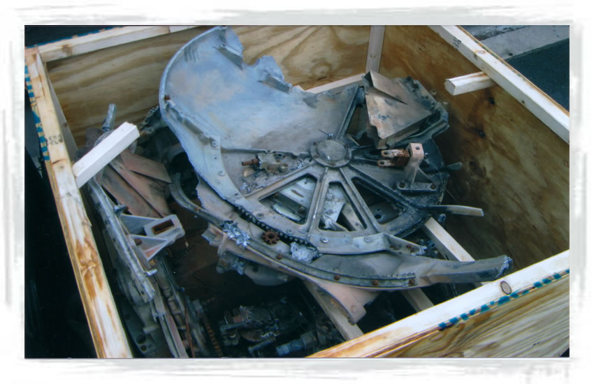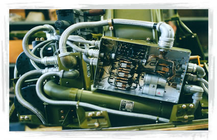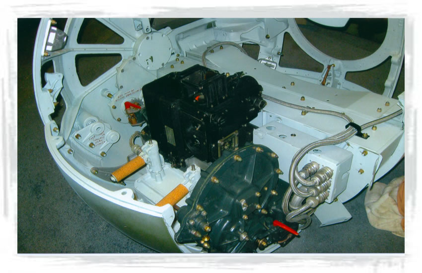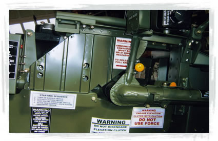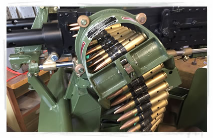| Trigger assembly installed in gun mount in turret. | Ammo guide with belt of replica .50 Cal ammo. |